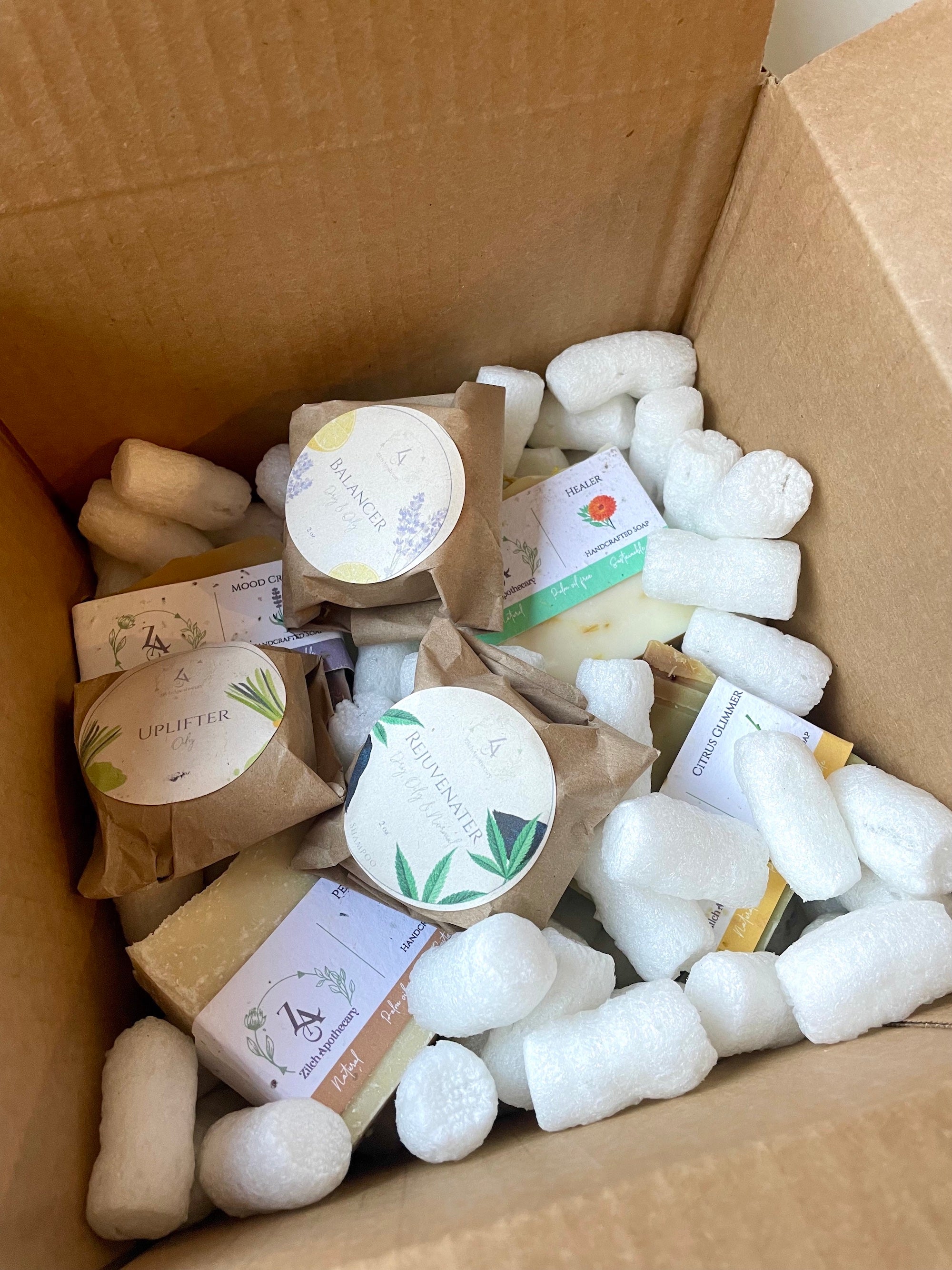 Our shipping materials - We use recyclable cardboard boxes, compostable tape, water-soluble/compostable corn starch peanuts(can be dissolved in your sink and are FDA compliant), reusable/recyclable kraft paper, compostable shipping label and adhesive!
